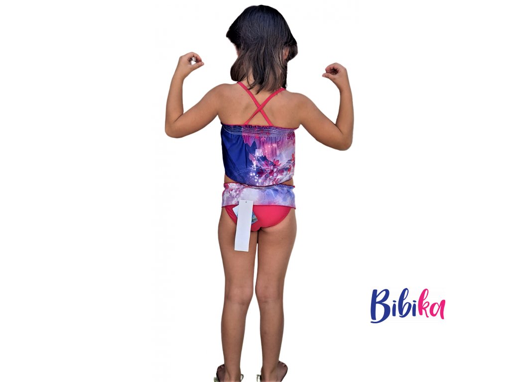 Dívčí 2dílné plavky fialovorůžové se skládají z kalhotek, kterézdobí široký kanýr v pase.