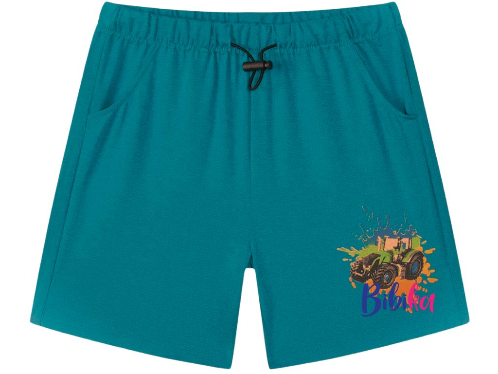 Velmi jemné a příjemné chlapecké šortky s parádním TRAKTOREM na nohavici.
